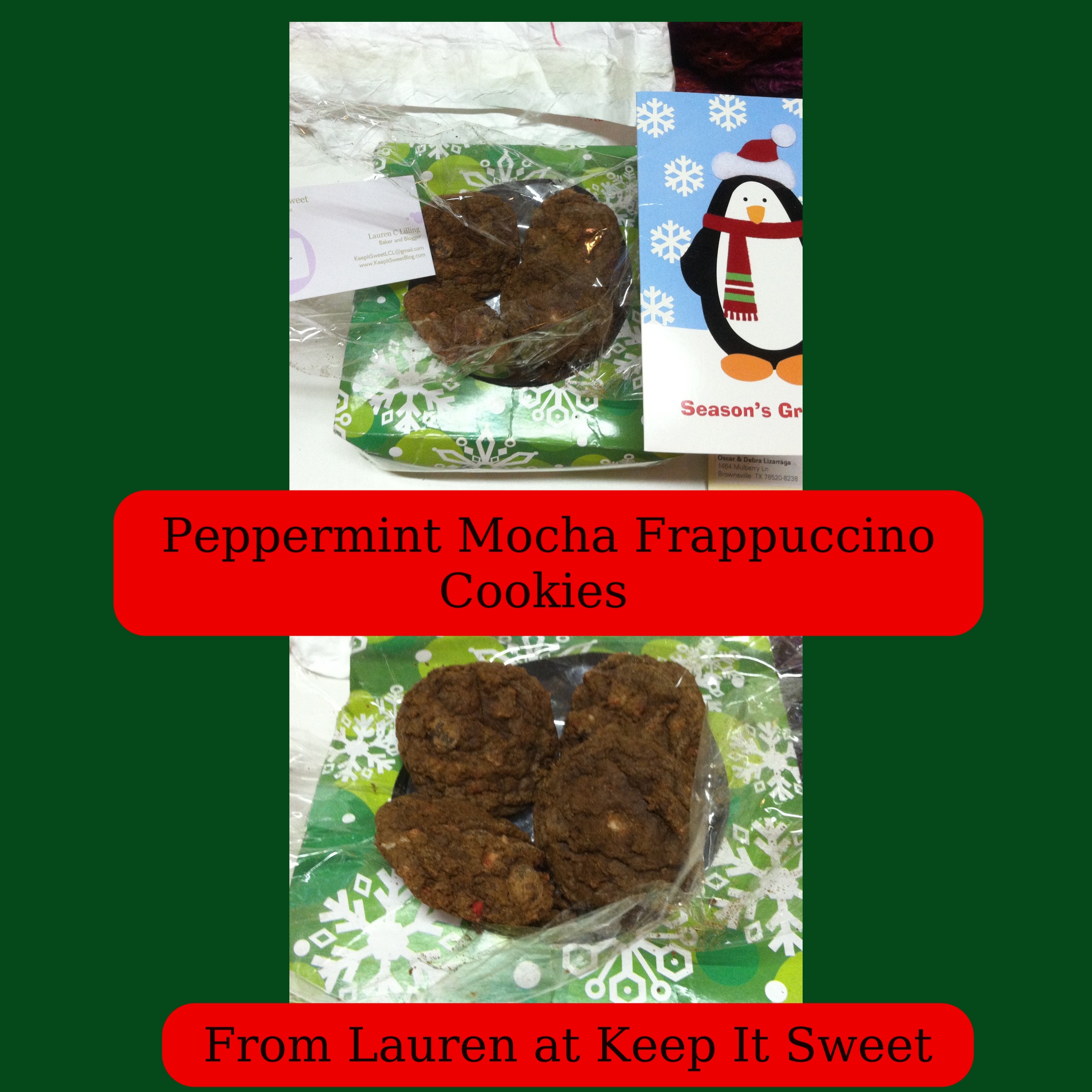 I received Cranberry Almond White Chocolate Chip cookies from Tara at ChipChipHooray, I received Chunky Chocolate Gobs from Beth at Eat.Drink.Smile and Peppermint Mocha Frappuccino Cookies from Lauren at Keep It Sweet. All three cookies were DELICIOUS! I am excited to be able to get the recipes for all three!