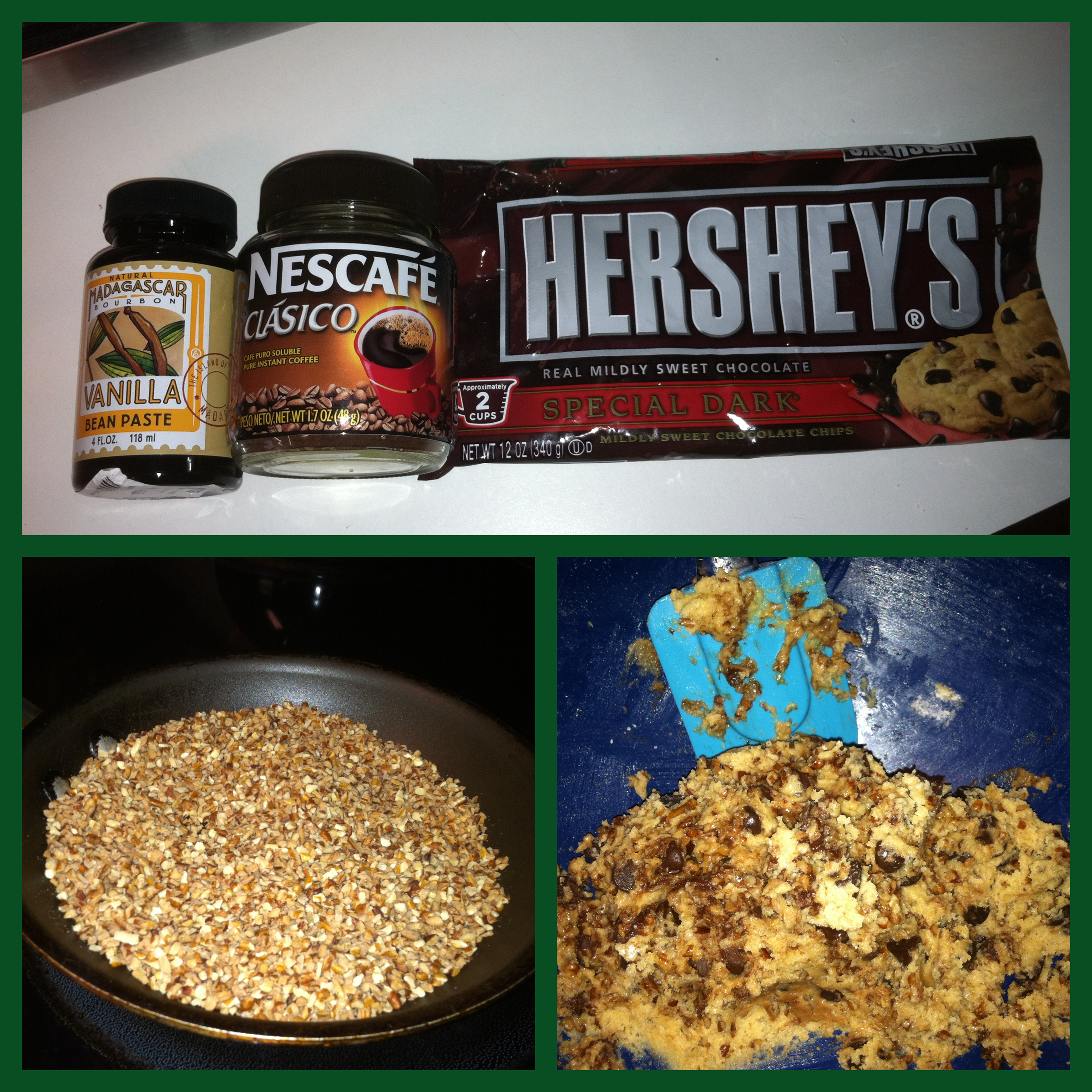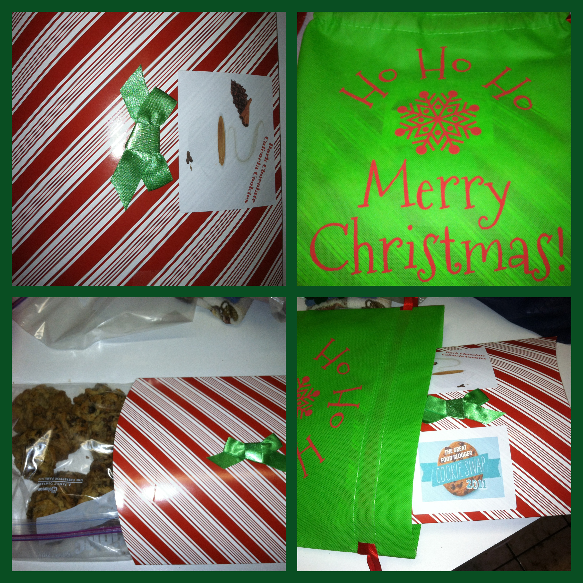 The cookies that I sent were called Dark Chocolate Cafenela Cookies. They are a recipe adapted from your basic chocolate chip cookie. I changed things up a bit and used dark chocolate chips, cinnamon and instant coffee granules.