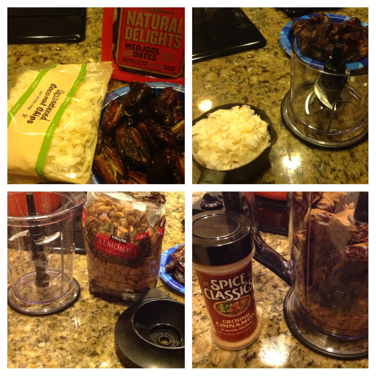 Pulse coconut flakes in a food processor until they look more like shreds and set aside. Pulse almonds in a food processor until they are chopped into small pieces.
